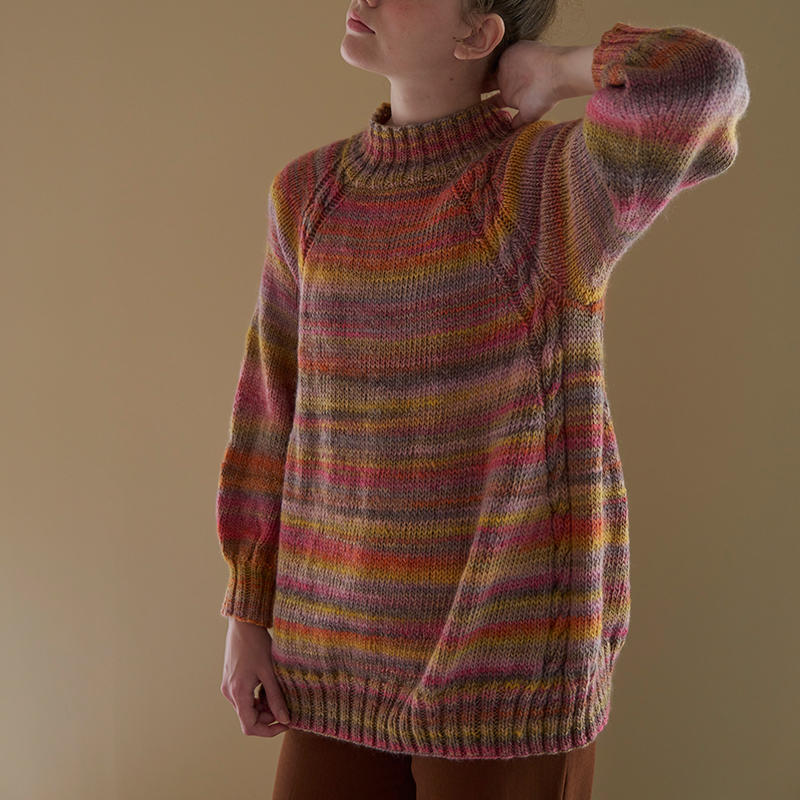編むだけで色の変化が楽しめる段染め毛糸は、トップダウンのニットと相性抜群。美しいグラデーションが身頃や袖で分断されることなく、展開していきます。増し目の隣に編むケーブル模様が、編みやすくて嬉しいデザインポイント。