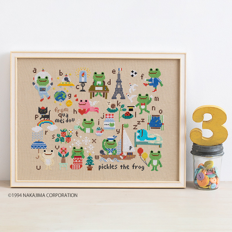 大きな愛らしい瞳で大人気の「かえるのピクルス」がクロスステッチ サンプラーになりました!