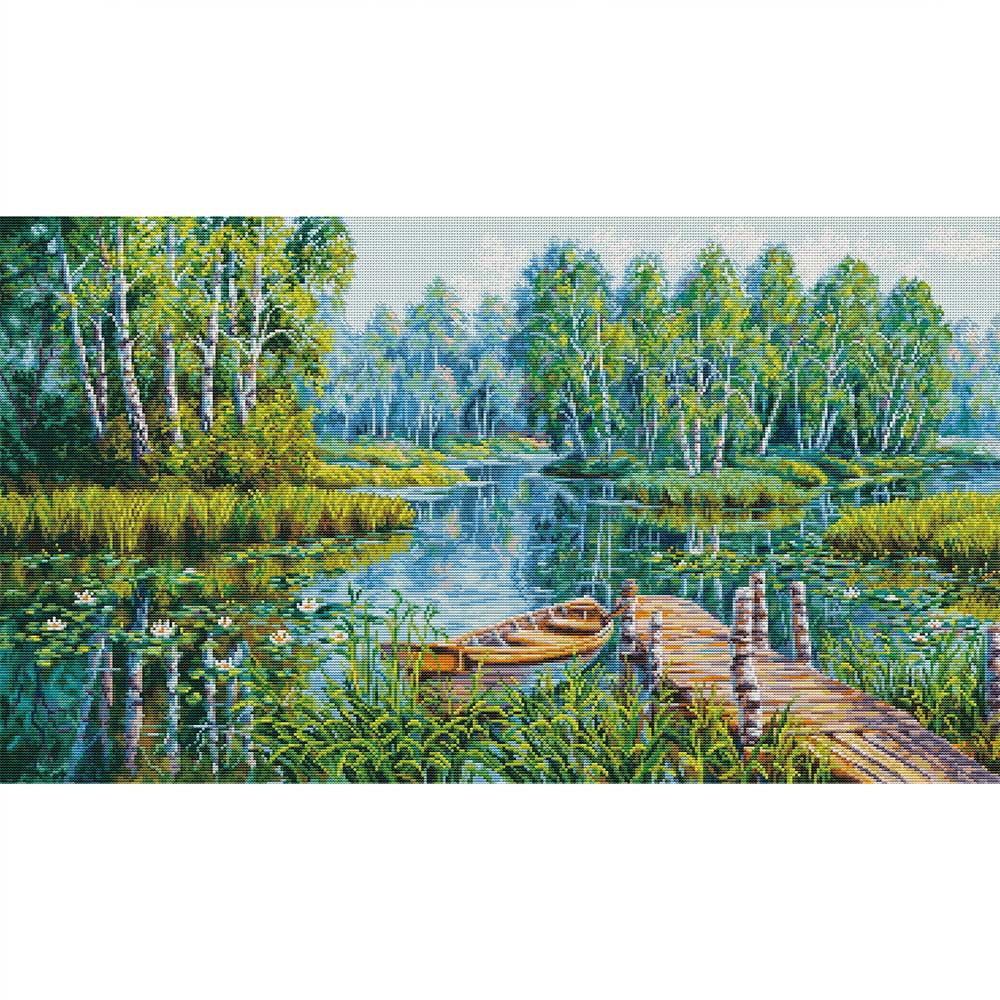 【キット作り方つき】水面に映るシラカバや新緑の草木が美しい、静かな湖畔を描いたクロスステッチ作品です。繊細な多色使いで、上級の方にお勧めです。