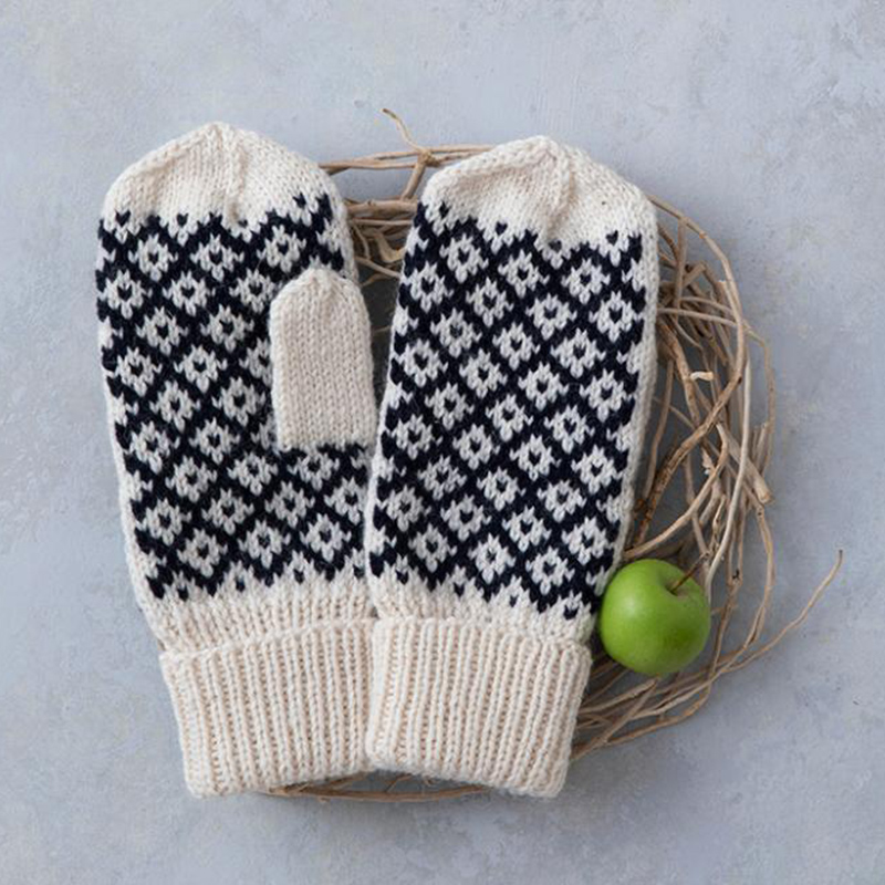 1目ゴム編みと編み込み模様、メリヤス編みで作るミトンは、棒針編みの表目・裏目・左上2目一度・ねじり増し目のテクニックで仕上げることができ、初心者さんにも分かりやすく失敗しにくい作品です。