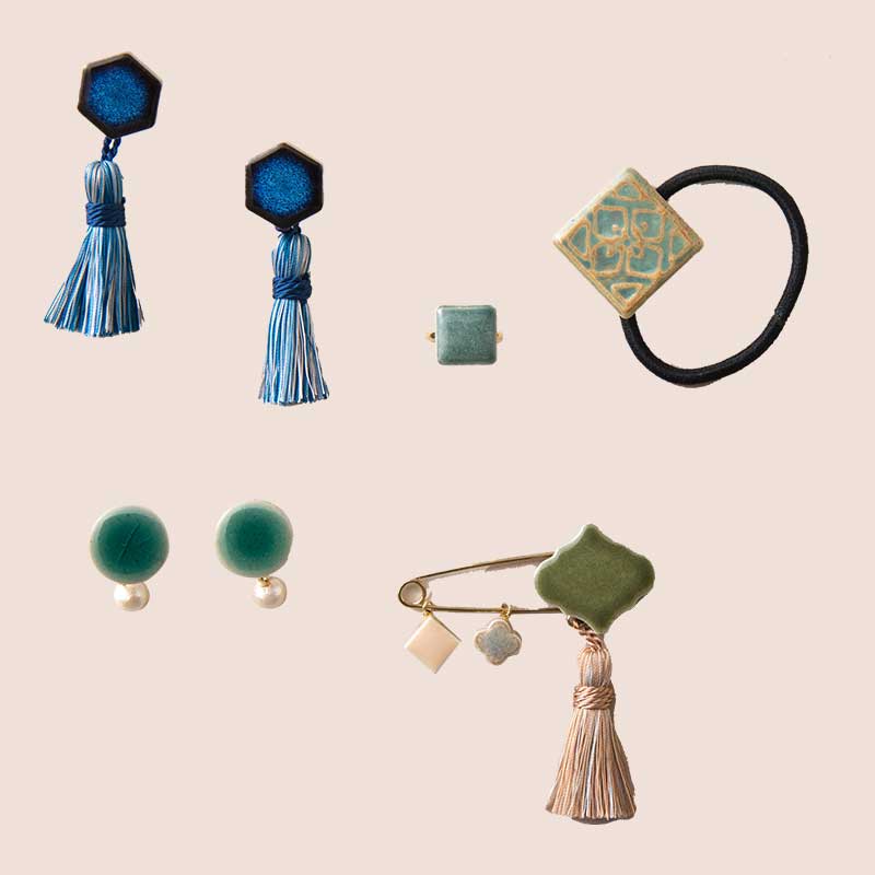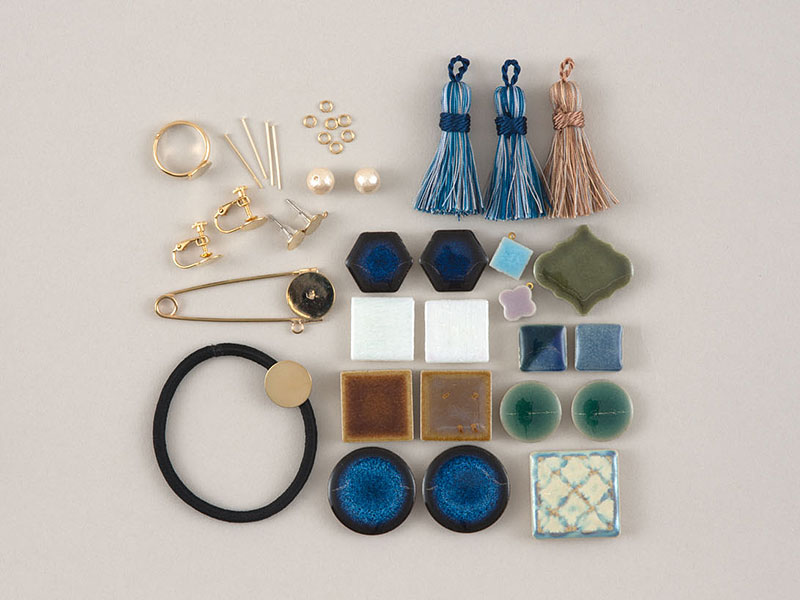 日本の伝統工芸、美濃焼のタイルの良さを身近に感じられる、タイル作家:園田直子デザインの手づくりキット。このキットで、ブローチ、ヘアゴム、ピアス、イヤリング、指輪の5点が作れます。タイルは余分に入っていますので、お好みのアレンジでもお楽しみいただけます。