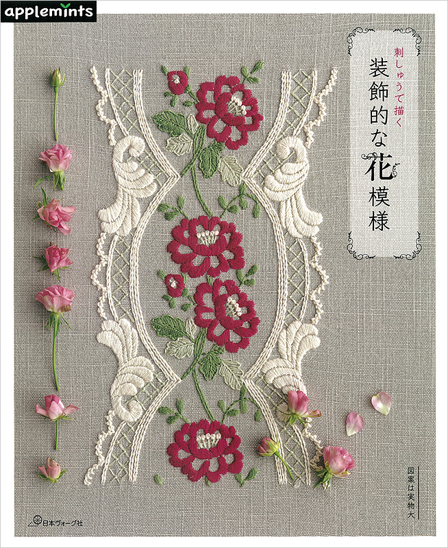お花を美しく装飾的に魅せるヨーロッパ刺しゅうの図案集。バラやチューリップなど、人気のお花をテーマに、フレームやレースなどと組み合わせワンポイント、連続模様にした図案をご紹介。刺した図案を実際にバッグやポーチなどに仕立てたもの、額装して飾った刺しゅうの楽しみ方もご紹介。