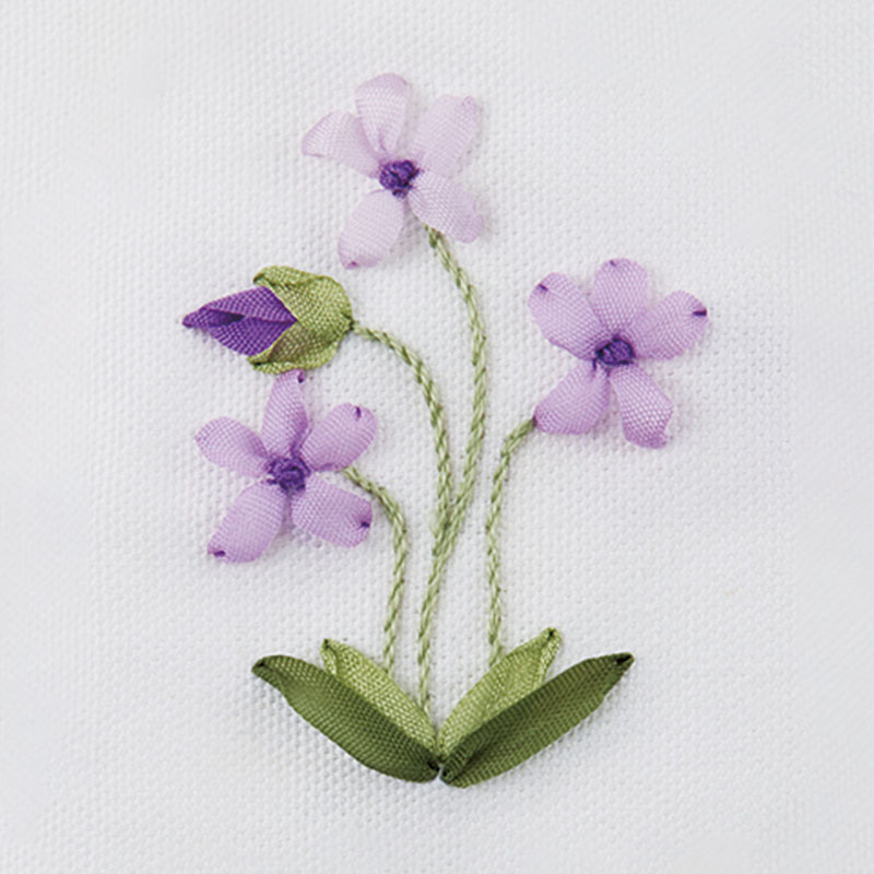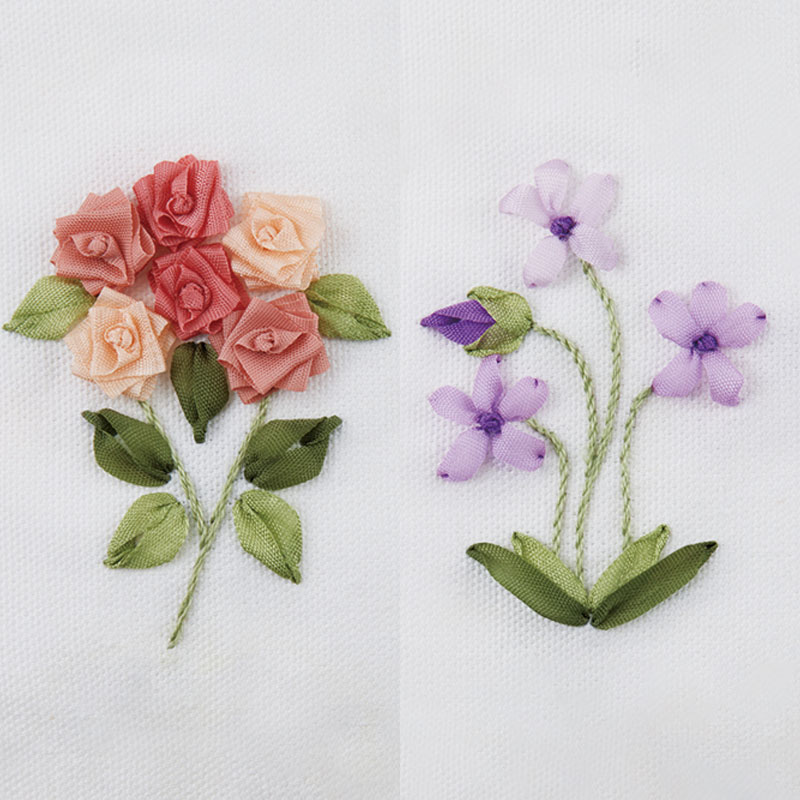 ステッチイデーvol.36 11ページ掲載の作品「バラとスミレ」に使用した、MOKUBAエンブロイダリーリボンをセットでお届けします。リボン刺しゅう専用の繊細な美しいリボンです。