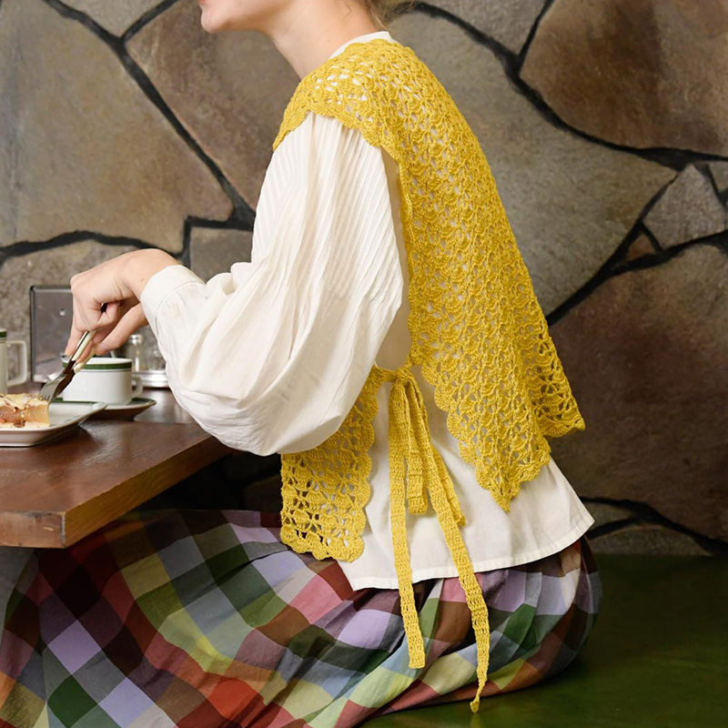 流行中のサイドオープンベストもかぎ針編みで。ハリのあるリネン糸で編む小さな単 位の模様編みは、どんなファッションにも合わせやすく、パンツ派にもスカート派にもおすすめ。トレンドカラーのイエローはコーディネートのアクセントになります。