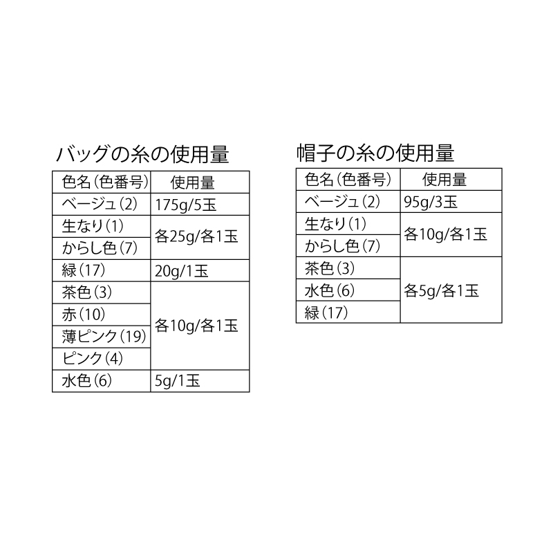 材料:オリムパス シャポット。糸の色名、色番号、使用量は図中の表を参照してください。