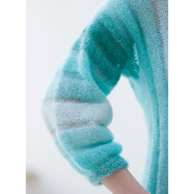 3色の糸から紡ぎ出される、爽やかなカラーグラデーション。横編みの模様に加え、2本どりと1本の編み分けがプリーツのように、エアリーで柔らかな雰囲気を醸し出します。模様が美しく続く袖にも注目です。
