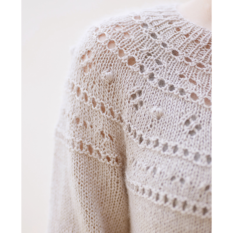 規則正しく並ぶかけ目の模様が、シンプルで美しいトップダウンのプルオーバー。弧を描くヨーク部分だけでなく、裾&袖口への配置も絶妙です。全体をモヘアヤーンとシルクヤーンの引き揃えで編んでいます。