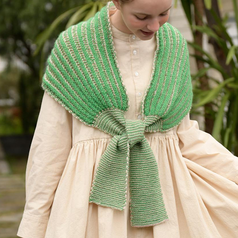 ライムグリーンとダスティピンクの色合わせが可愛い、両端をボウのように結べるノスタルジックスタイルなショールです。本体は引き上げ編みを2目ゴム編み状の縞に編むことでリバーシブルに楽しむことができます。