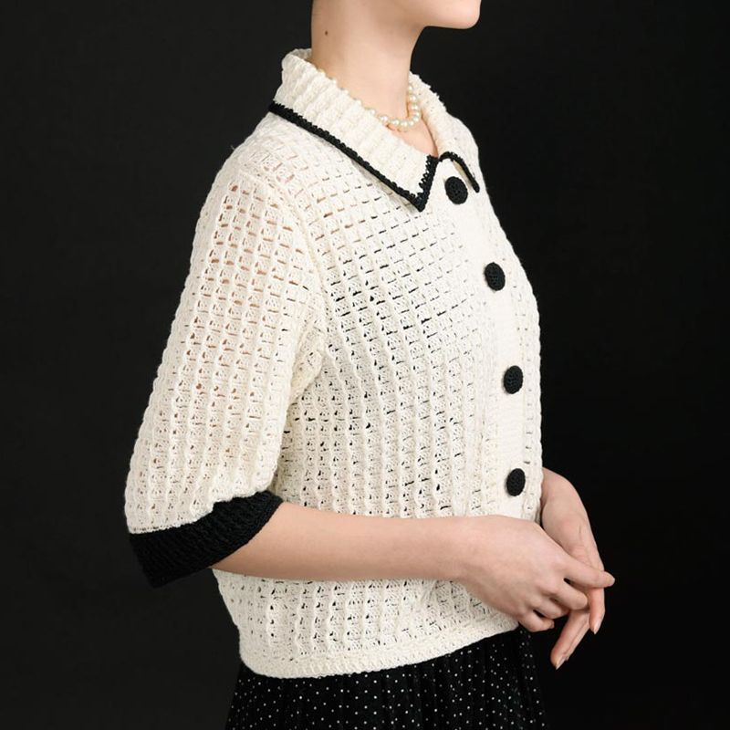 引き上げ編みのラインがポイントのジャケットは、セットインスリーブに衿もつけてきちんと仕上げましょう。編みくるみボタンがキュートな引き締め役になっています。