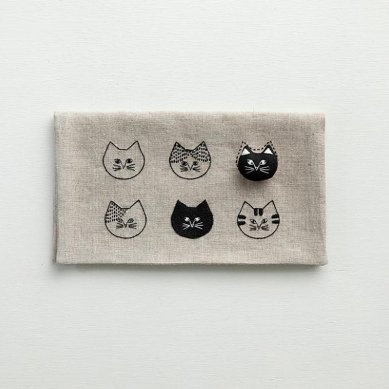 トラねこ・白ねこ・黒ねこなどほっこりするねこの顔を刺しゅうした二つ折りのぺたんこポーチ。