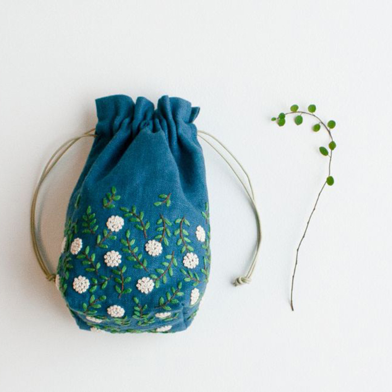 底が正方形のころんとしたかわいい形の巾着。風に舞う白い花をイメージしたデザインです。