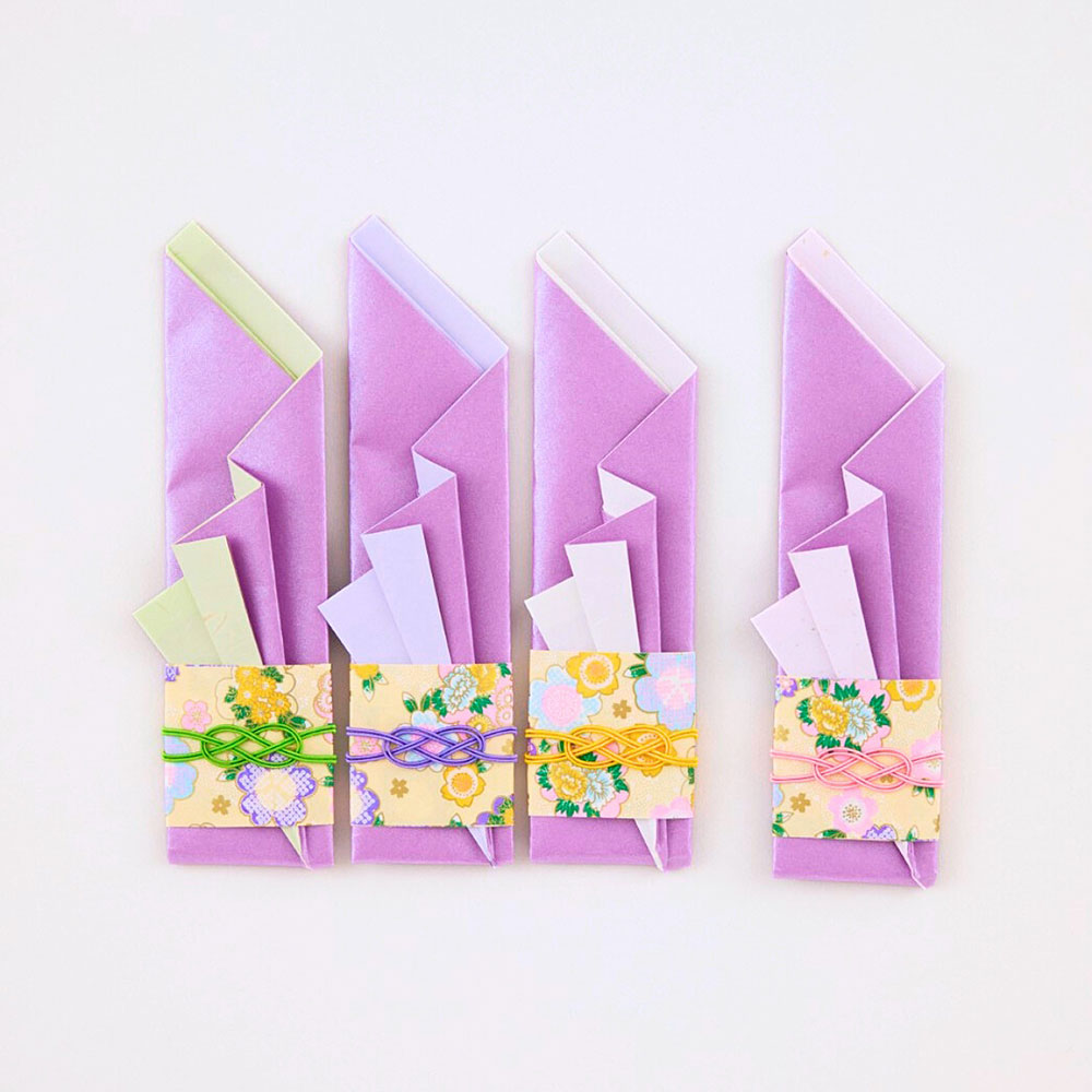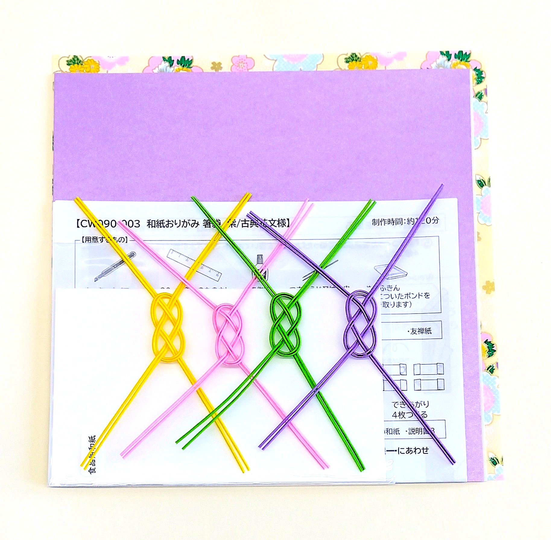 エンボス紙4枚・伊予和紙4枚・友禅紙1枚・食品用和紙2枚・水引飾り4個・説明書※4セット分