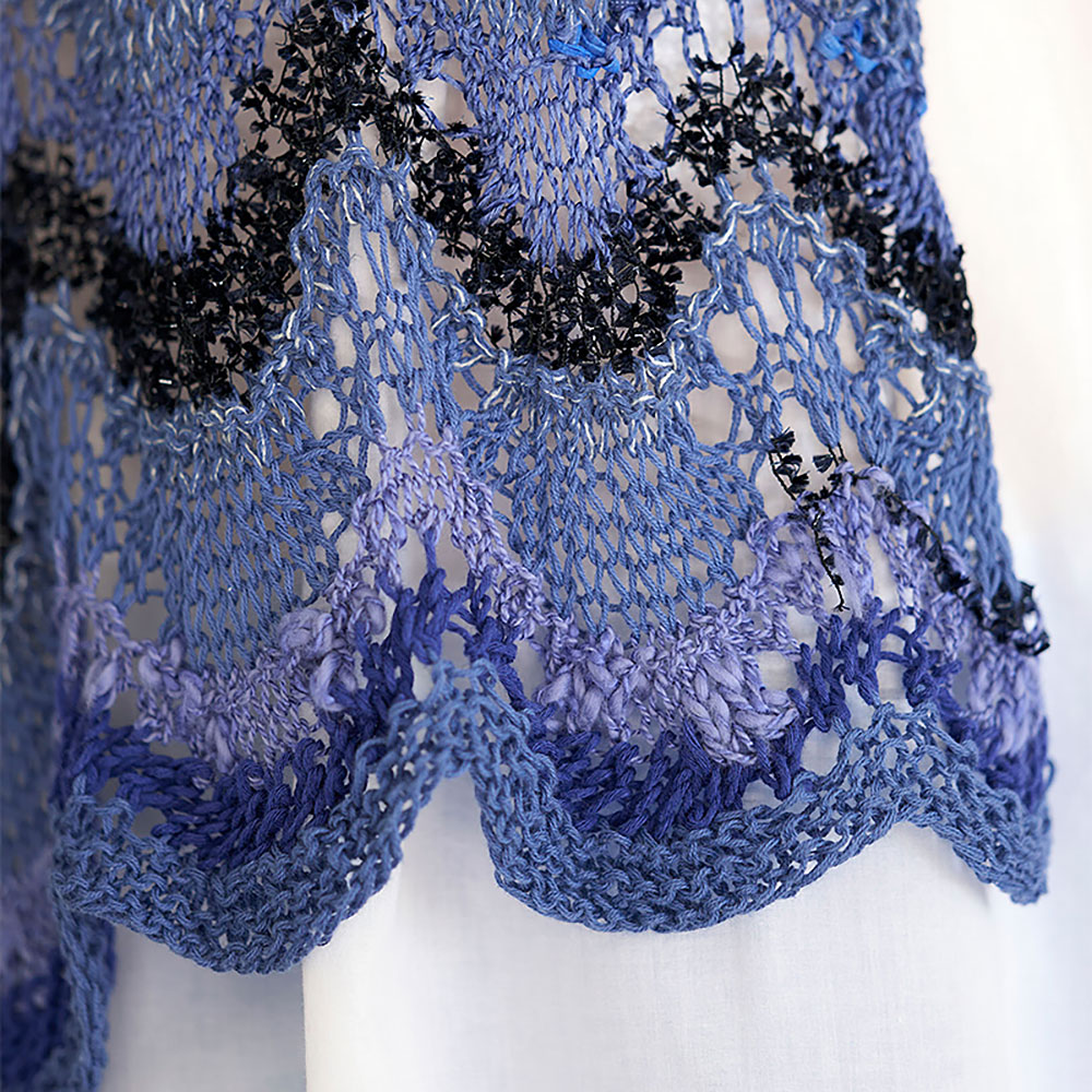 波模様を編みながら、次々と変わる素材を楽しむことができるショール。透け感のあ る涼やかなアイテムで、色によって様々に印象が変わります。