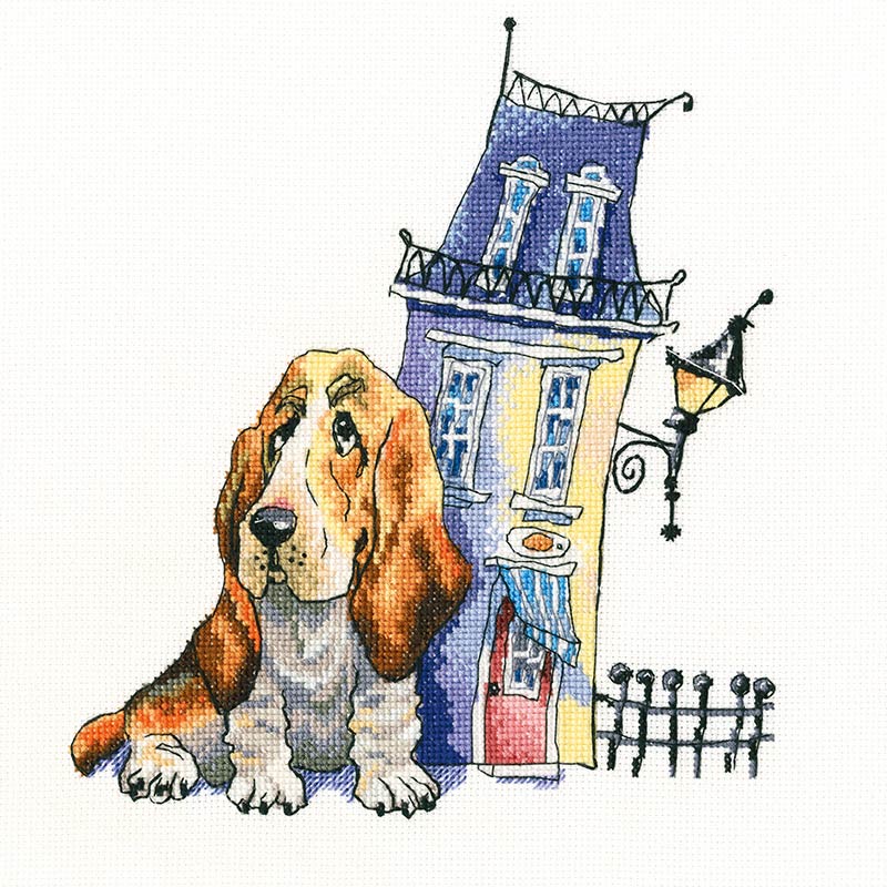 【キット作り方つき】イラストタッチで描いた、ダックスフントとハウスのクロスステッチ作品。大きくて見やすい図案つきで、中級の方にお勧めです。エストニア・RTO社製。
