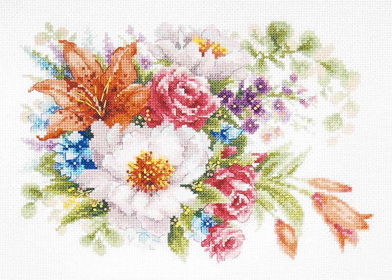 【キット作り方つき】色とりどりの花のブーケを描いた、優 しい雰囲気のクロスステッチ作品です。中~上級の方向き。