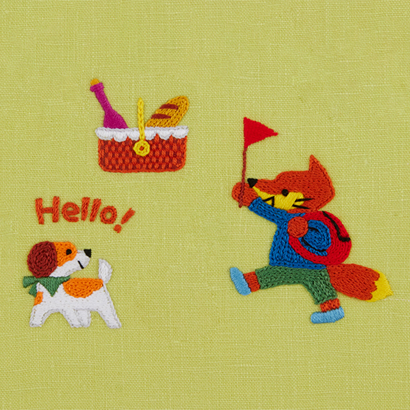 パンかごを持って、ピクニックを楽しむどうぶつたち。刺しゅうワッペンをお洋服やバッグに付けたり、お手持ちの小物に直接ワンポイント刺しゅうするのもおすすめです。