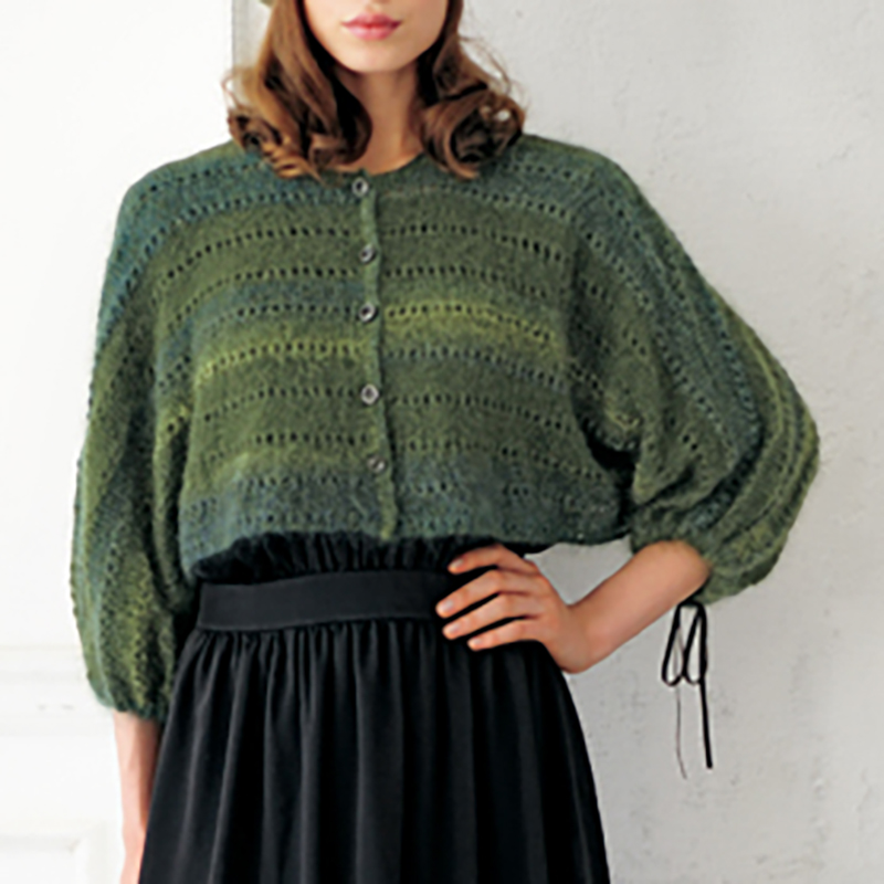 同じ太さの<カウント10>の単色とグラデーションを巧みに組み合わせることで、さらに複雑な色の変化をもたらした、変形ボレロ。基本的なシルエットはまっすぐなので、手軽に編み始められます。