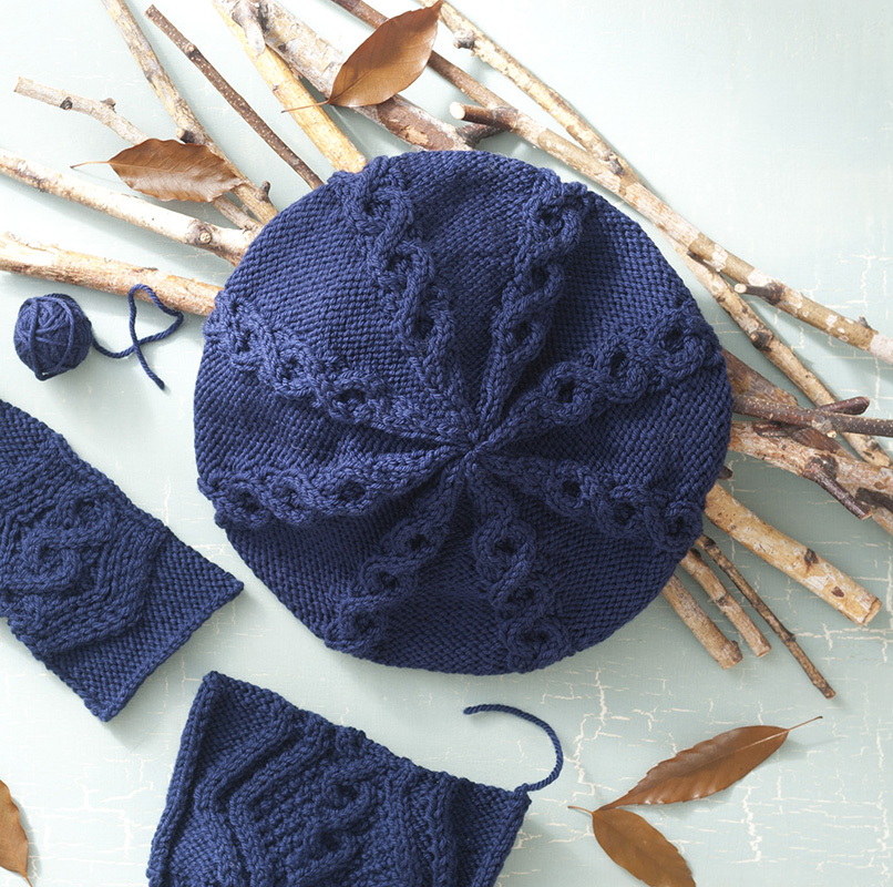 アラン諸島の深い海を思わせる、ネイビーカラーで編み上げた衿つきカーディガンとベレー帽の一揃い。裏メリヤス編みを入れることで、大きい模様がひと際映えて。ベレー帽には中心のスプーンのケーブル模様だけを入れました。
