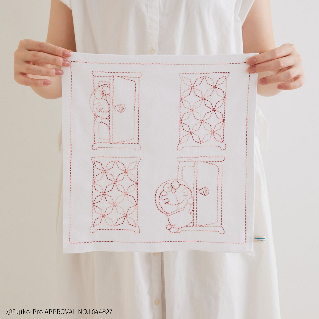 ドラえもんと日本の伝統柄「角七宝」が楽しめる刺し子キットです。 角七宝は縁起の良い七宝を直線的に変化させた柄です。 おなじみのドラえもんのひみつ道具「どこでもドア」から顔を出すドラえもんと組み合わせて、かわいいふきんにしました。
