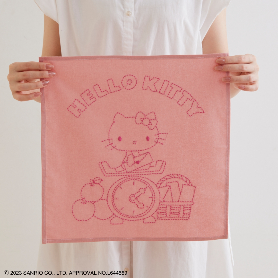 70年代のレトロなキティが魅力的な刺し子のキット。はかりの上に乗ったキティやリンゴ、手紙、バスケットなど、どこか懐かしくて、キュンとするようなかわいらしいモチーフがたくさん。ちくちく刺すのが楽しくなるデザインになっています。ピンクの布に、ピンクの刺し子糸の組み合わせで、デザインのかわいらしさをより引き立てます。