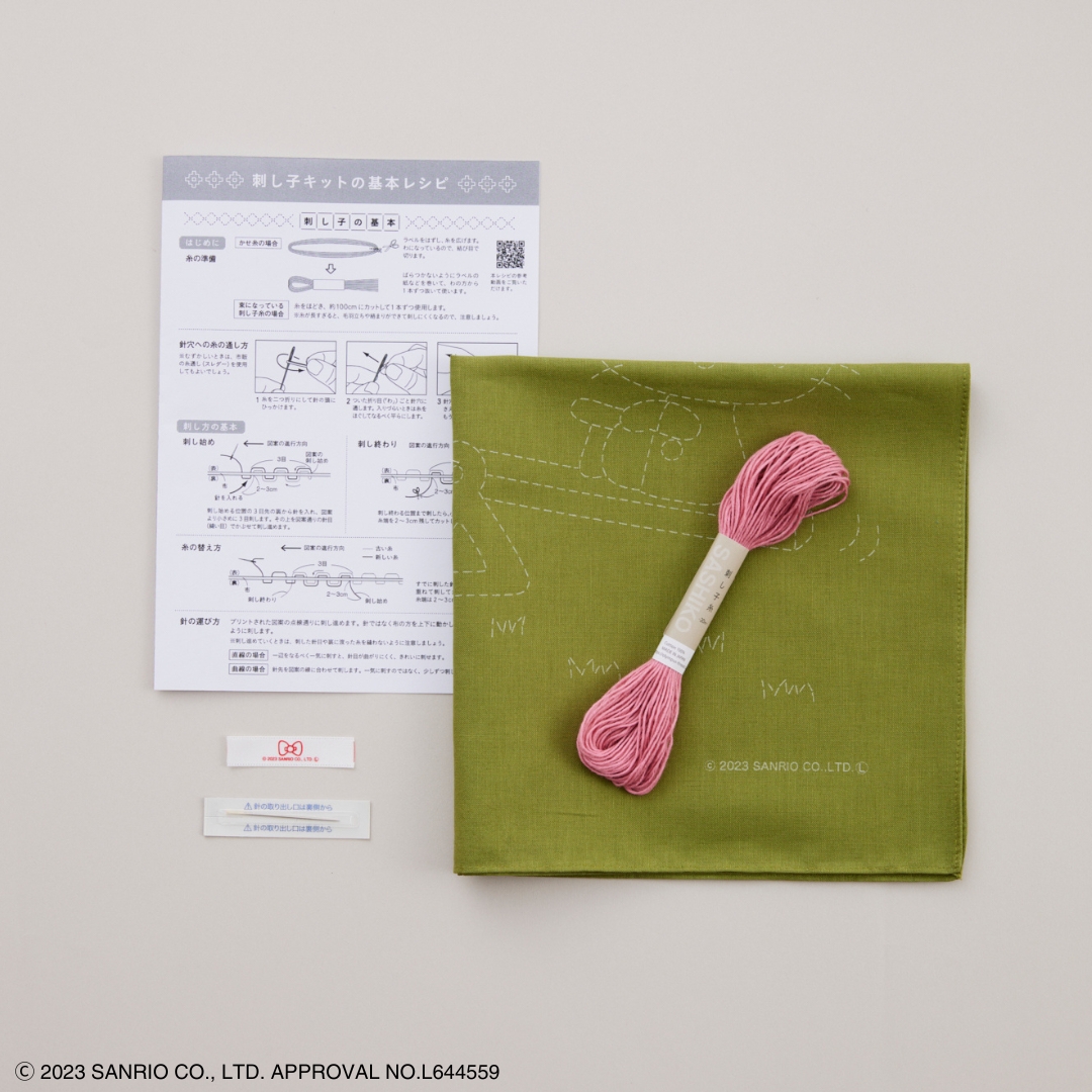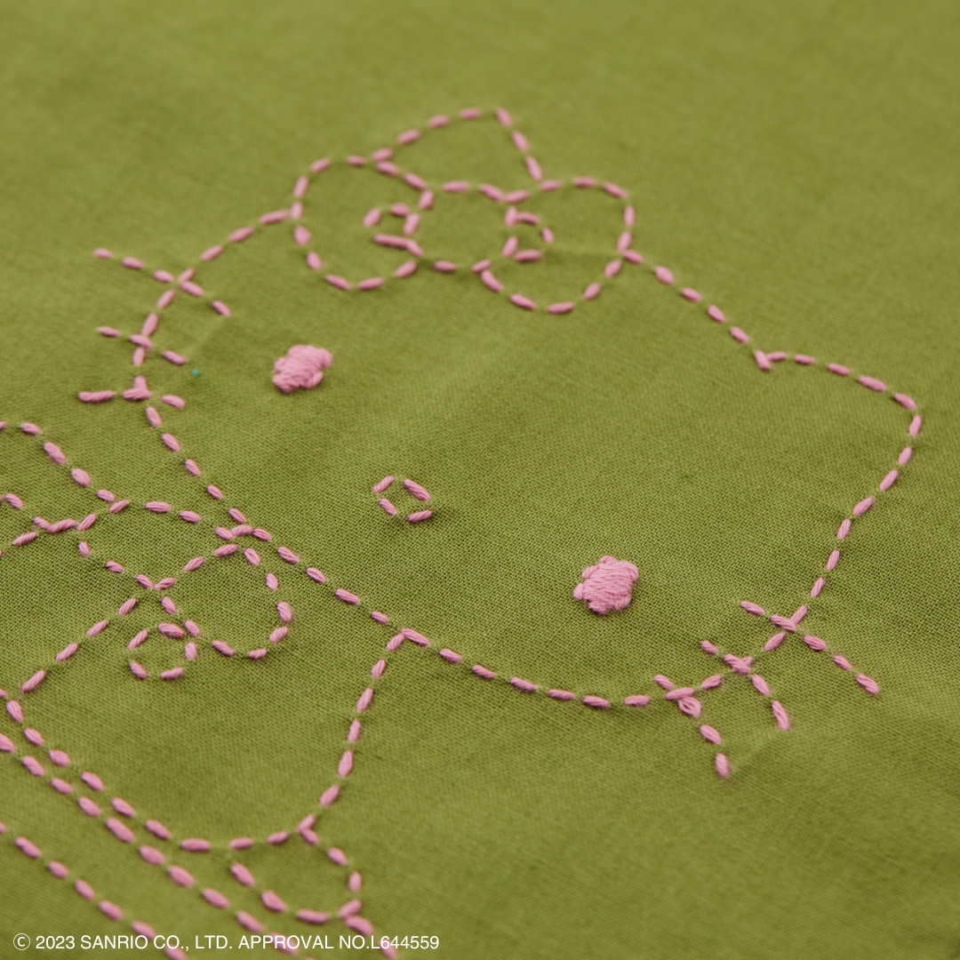 70年代のレトロなキティが魅力的な刺し子のキット。キティと双子の妹ミミィがシーソーを楽しむデザイン。仲のよい様子が伝わってきます。野原をイメージしたモスグリーンの布に、かわいらしい二人のイメージのピンクの刺し子糸を組み合わせました。心あたたまるデザインで刺し子をお楽しみください。