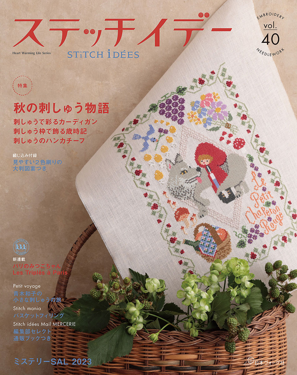 特集1は「秋の刺しゅう物語」。実りの秋、おいしいものの秋、秋の童話、森の動物たち。さまざまな秋の場面を刺しゅうで彩ります。特集2はクリスマスやお正月、干支、雛祭りなど歳時記をテーマに、さまざまなタイプの刺しゅう枠に飾って楽しむ提案です。