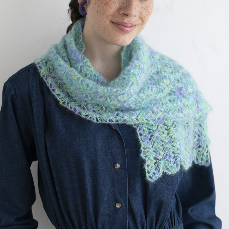 鎖編み、細編み、長編みで編めるかぎ針編みのショール。この色はDown By The River「川のほとり」をイメージして染められました。模様の見え方も楽しみながら編んでくださいね。