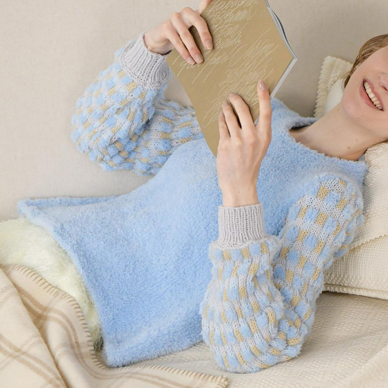 身頃はすべて爽やかブルーのふわもこヤーン、袖はストレートヤーンと市松の編み込み模様にした、とにかく可愛いデザイン もこもこに隠れていますが、裾と衿はクルンと丸まってしまわないようガーター編みにしています