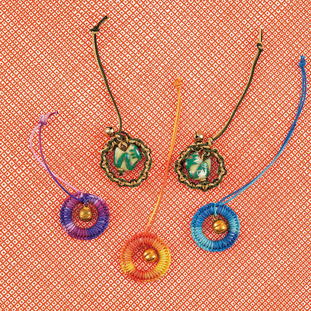 【キット作り方つき】ねじり結びを左右にジグザグ雷のように結んで、龍の陶玉ビーズを囲んだ勇ましい根付。鈴のついたカラフルな輪の根付3色は、丸井パーツに結んでいくだけの簡単仕立て。どちらも簡単に作れます。年始の贈り物にもぴったり。特別な道具は必要ありません。初級