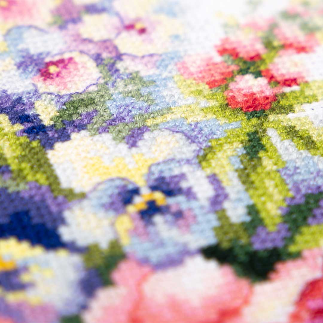 【キット作り方つき】ピオニーを主役に、色鮮やかな 花々をブーケにしたクロスステッチ作品です。上級の方へ。
