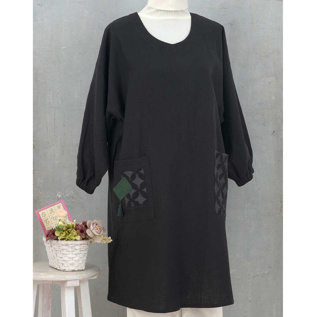 【限定10】【完成品】本体は麻素材、ポケット部分に久留米絣をあしらった和モダンテイストのエプロンドレスを2種 ご用意。しっかりとした地で膝まで暖かくカバーします。袖口は掃除や家事もしやすいゴム仕立て。