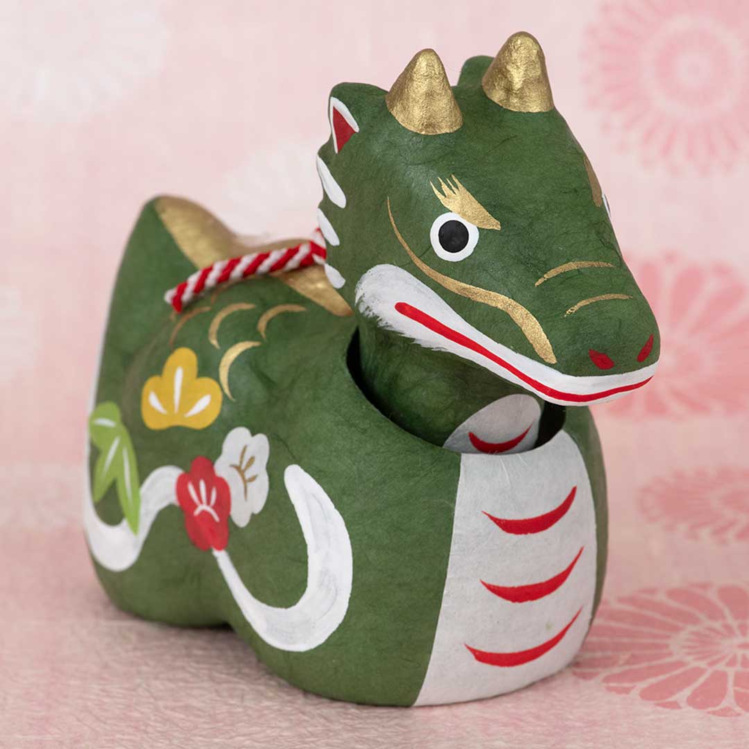 【完成品】【限定70】幸せを招くように首を振る和紙の張り子飾りです。勇ましい辰は力強く家を守ってくれそう。新春の特別感を盛り上げる、おめでたい松竹梅の絵柄入りです。