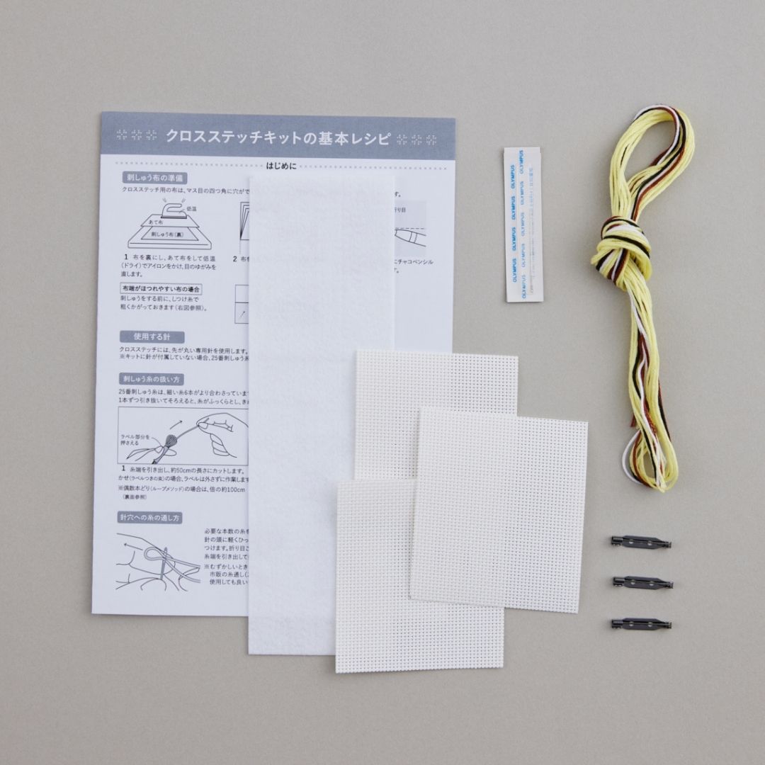 キットにはクロスステッチ図案や作り方とは別に「クロスステッチキットの基本レシピ」がついてきます。刺しゅう布の準備から基本の刺し方、作品の仕上げ方まで、イラスト入りでていねいに解説しました。疑問点をクリアにしてから、刺し進めることができます。