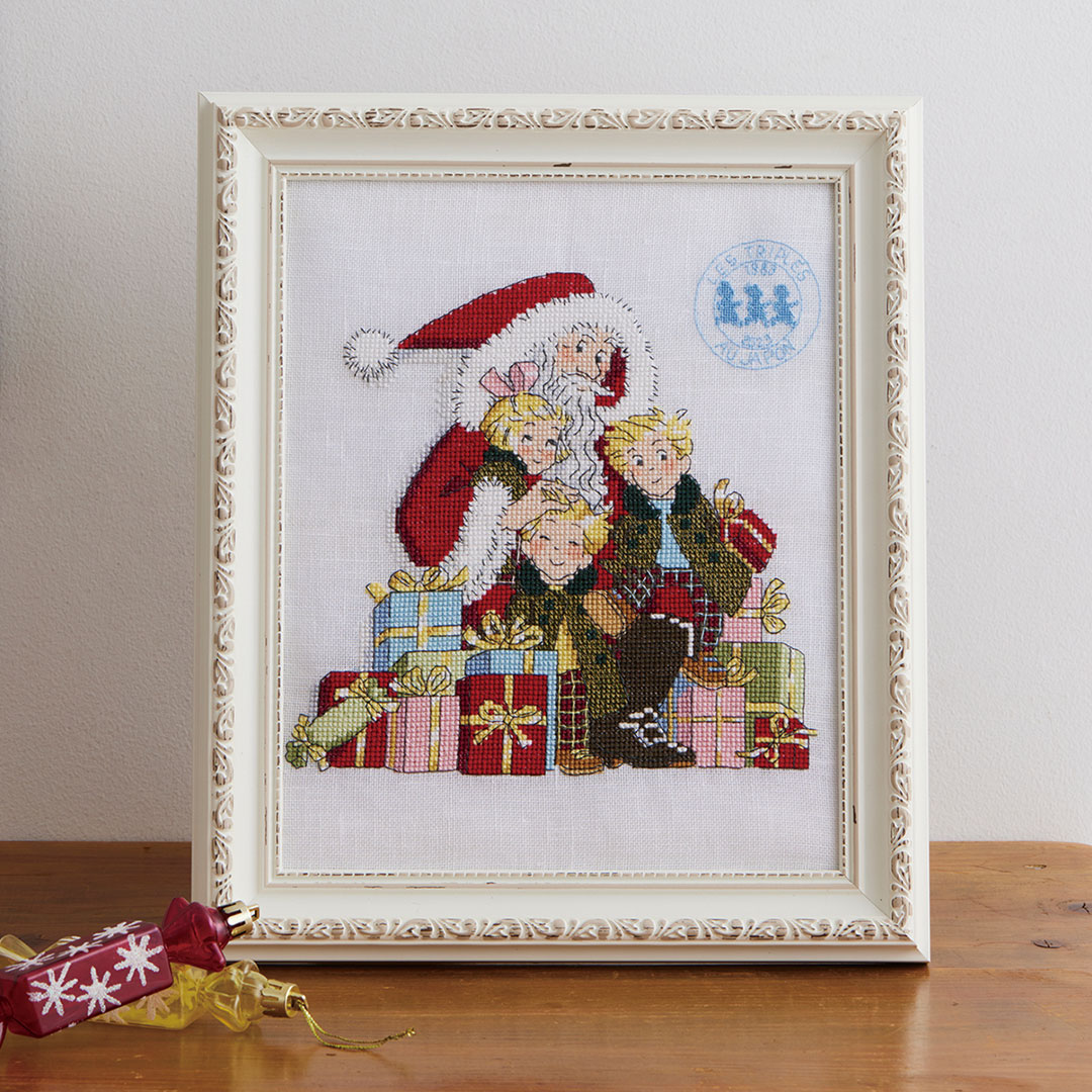 白い木目調の大型額。SALの作品がぴったり収まるサイズです。リネンの作品はマットなし、アイーダの作品はマット入れて飾っています。やわらかい白色に連続模様の装飾の入った額。クリスマスの作品に彩を添えてくれます。