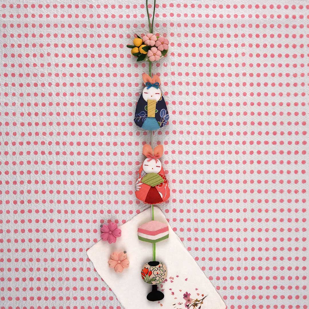 【キット作り方つき】【古裂】小さなウサギの内裏びなと装飾品を1本にまとめた、つり下げて楽しめる桃の節句飾りです。