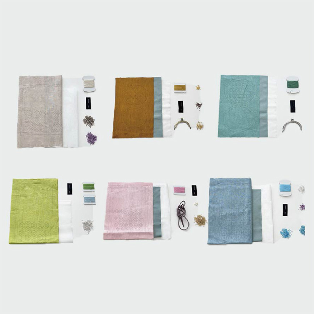 図案印刷済みリネン生地、接着芯、ビーズ各種、刺し子糸、フランス刺しゅう針、その他作品制作に必要なパーツ、ひもなど、作り方説明書