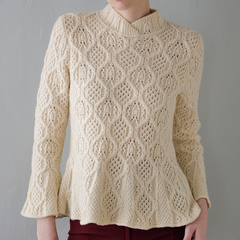 糸は模様がはっきり見えて編みやすいウール100%のストレートヤーン。色はどんな模様も受け止めてくれる生成りです。袖口と裾に三角マチを入れてフレアにしました。いつもなら模様の大きさを変化させたり模様の間の目を増すことによって広がりを出すのですが、今回はそこに異なる模様の三角マチを入れ、今までと編み方を変えてみました。