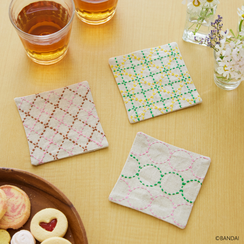 作品は約10×10cmのコースターが3枚仕上がります。(※洗濯前のサイズ。水につけると1割程度縮みます。)