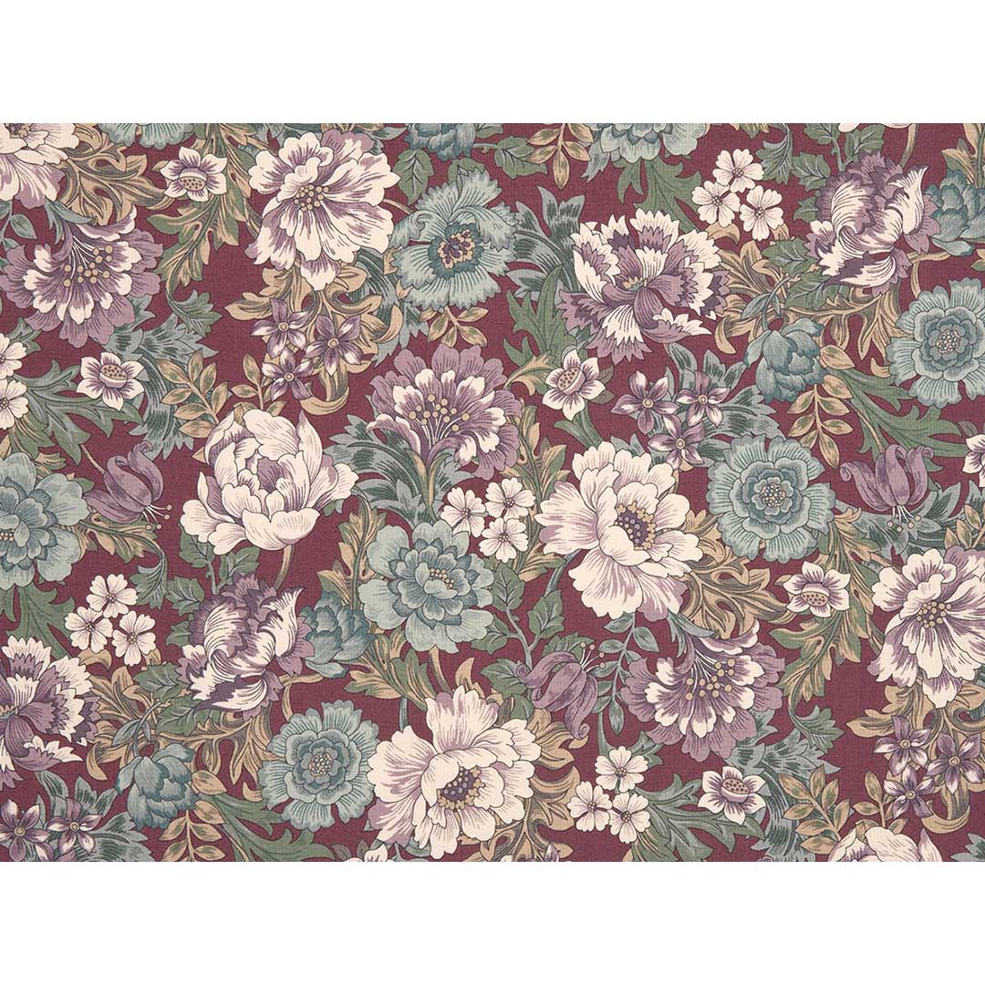 深いえんじの地にドライフラワーのような草花を描いた、アールヌーヴォー調のエレガントなプリント布。パッチワークはもちろん、スカートやワンピースなどにも。