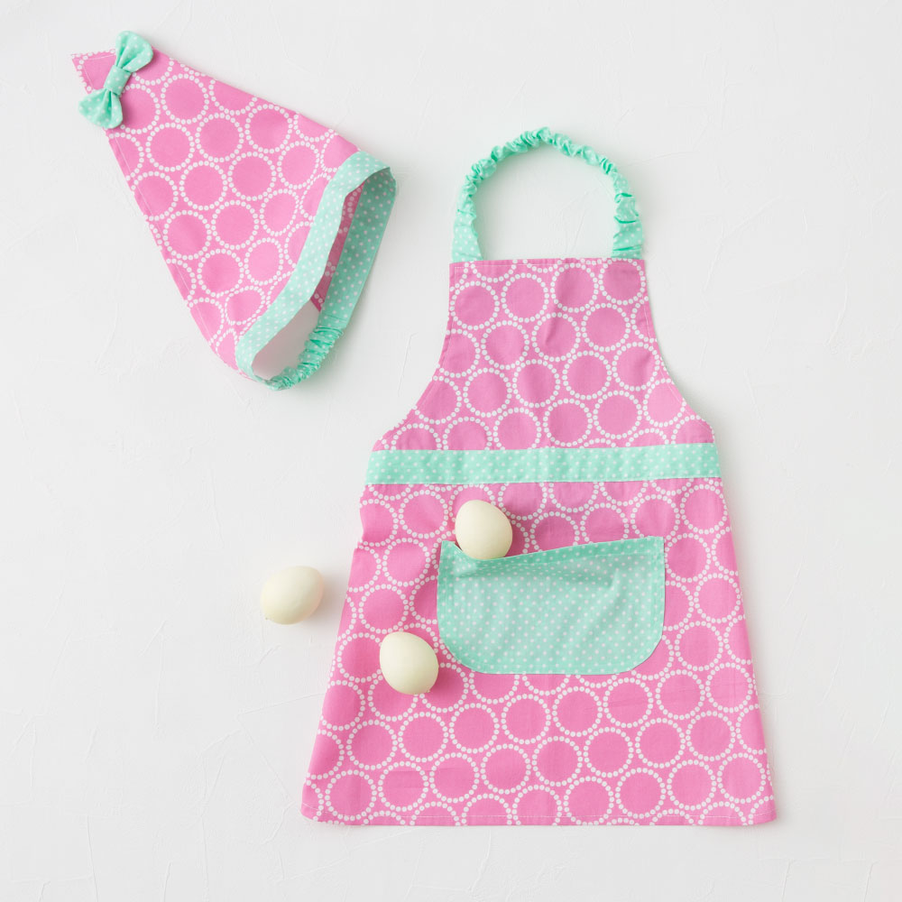 ひも部分にゴムを通して、一人でも身につけやすくしたエプロンと三角巾です。大きなポケットがアクセント。2種類の布を使うことでメリハリが出ておしゃれな仕上がりになっています。