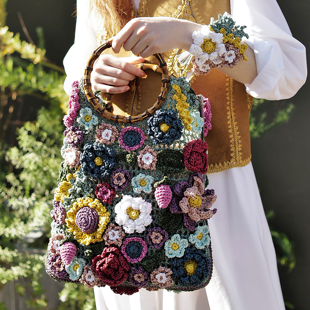 春の歓びを詰め込んだ、花束みたいなバッグ。モスグリーンの方眼編みのベースに、大小様々な花々とベリーを飾りました。全10色の糸を組み合わせた絶妙なカラーリングも編み応えがあります。お揃いのブレスレットも素敵でしょ?