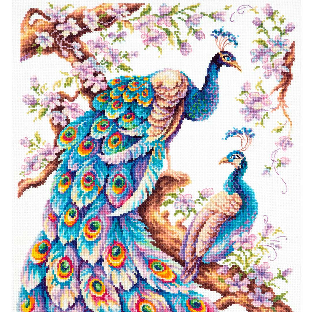 【キット作り方つき】仲睦まじいクジャクのペアを描いた、優美なクロスステッチ作品です。上級の方へ。