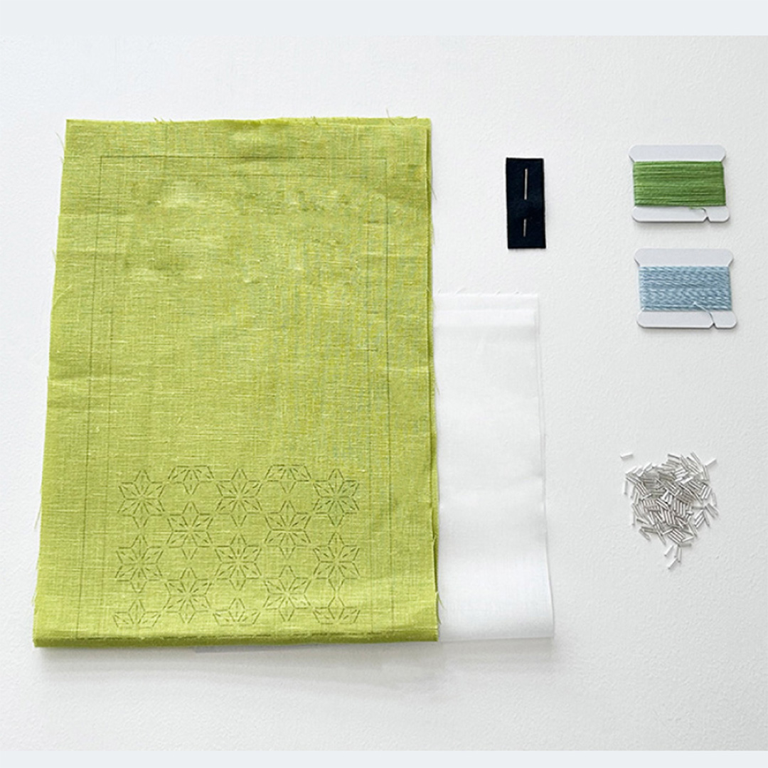 刺し子の伝統模様をビーズ刺しゅうで楽しむ「ビーズ刺し子」。印刷済みの図案線に沿って一針一針ビーズを通しながら刺していくと、刺し子の伝統柄が美しく浮かび上がります。