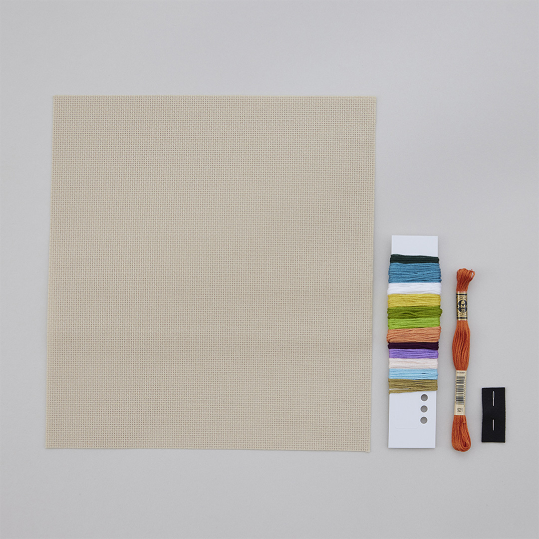刺しゅう用布(アイーダ 14カウント)、DMC25番刺しゅう糸(13色)、クロスステッチ針、作り方説明書、クロスステッチ図案