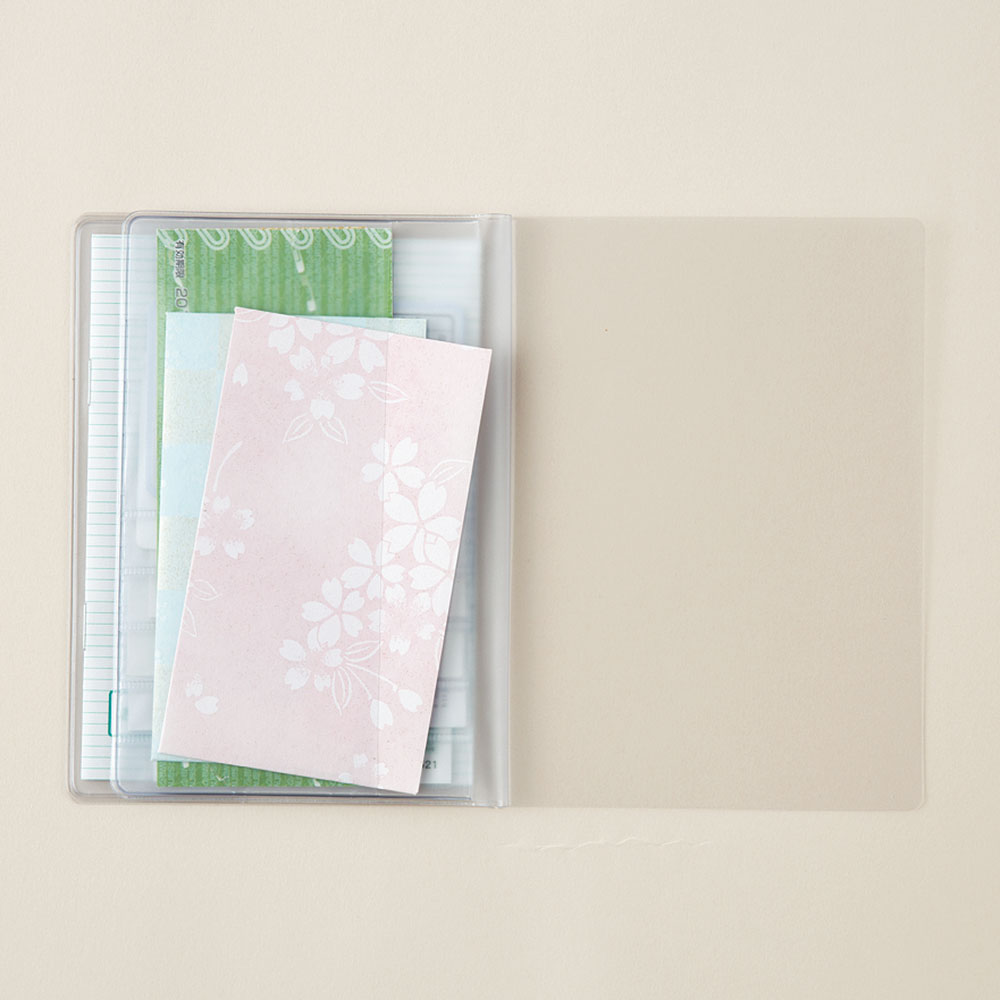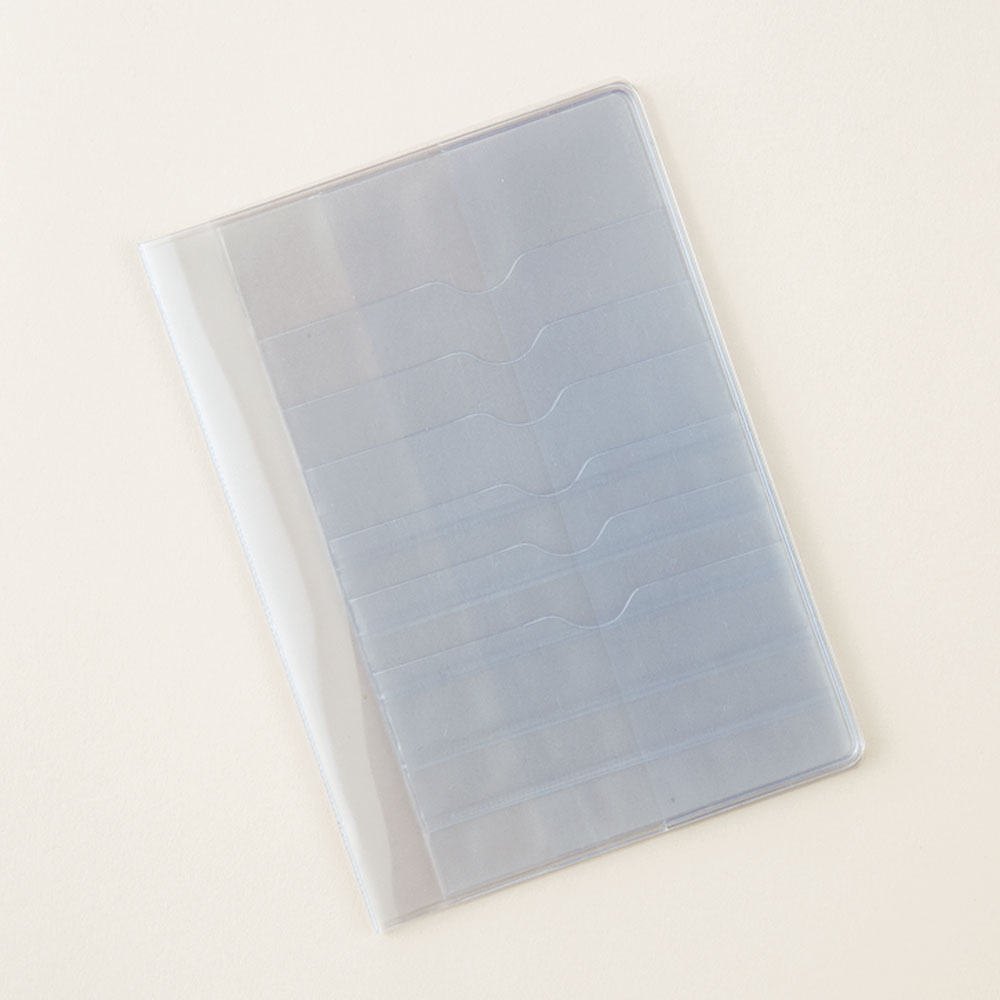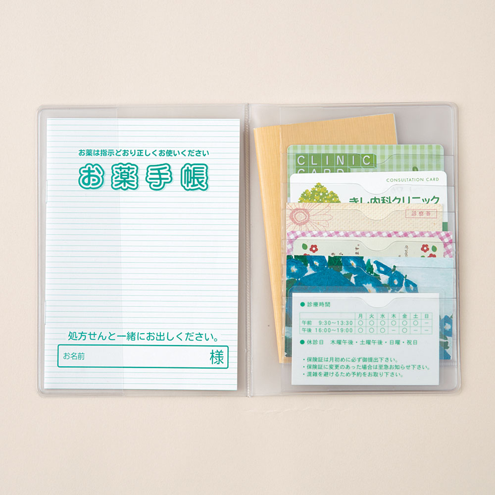 お薬手帳や診察券の収納に便利なクリアケース。カードポケットが6カ所、大きめポケットが3カ所あります。