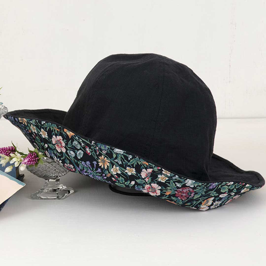【限定40】【完成品】ベースはリネン、つば部分にリバティ・ファブリックスを合わせた落ち着きあるハットです。ベースの色&つばの柄が異なる2種をご用意。上品でおしゃれな装いを演出してくれます。