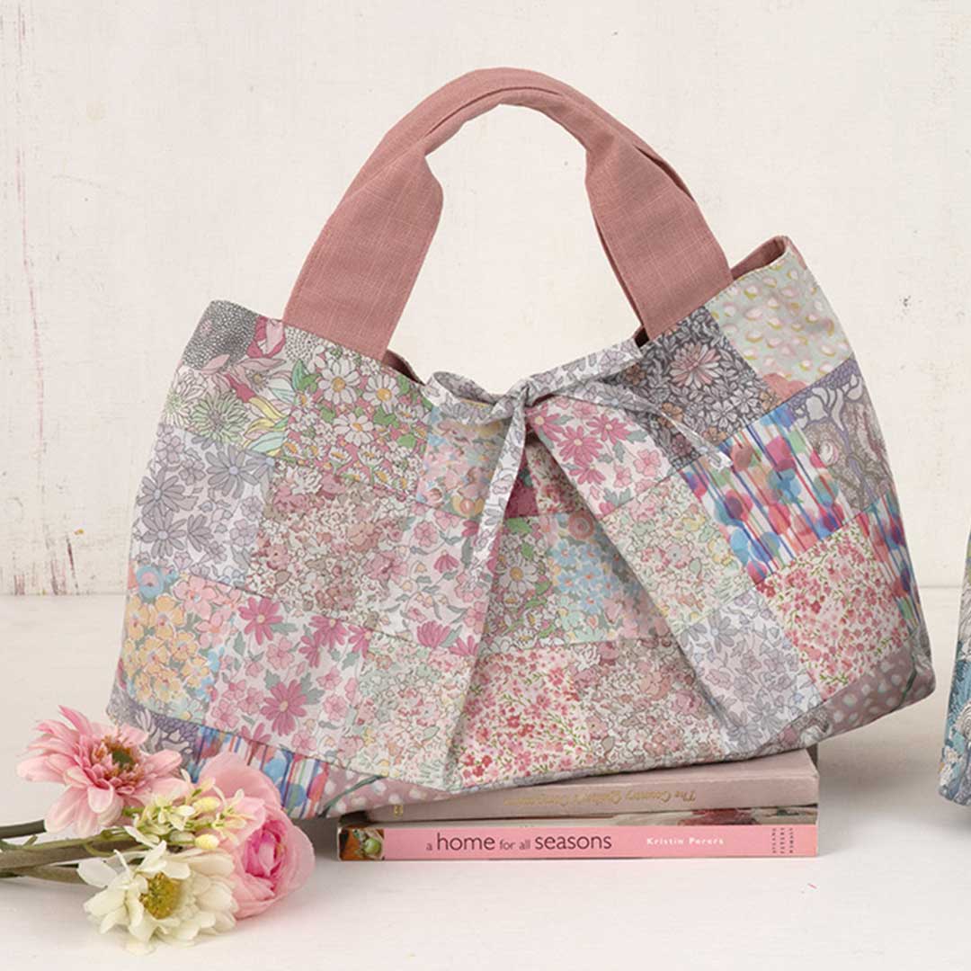 【限定60】【キット作り方つき】1枚1枚が美しいリバティ・ファブリックスのスワッチをつないで作るバッグです。中央にタックを寄せてマチも広いたっぷりデザイン。可愛い ピンクと落ち着いたブルーをご用意しました。