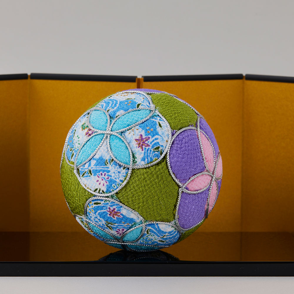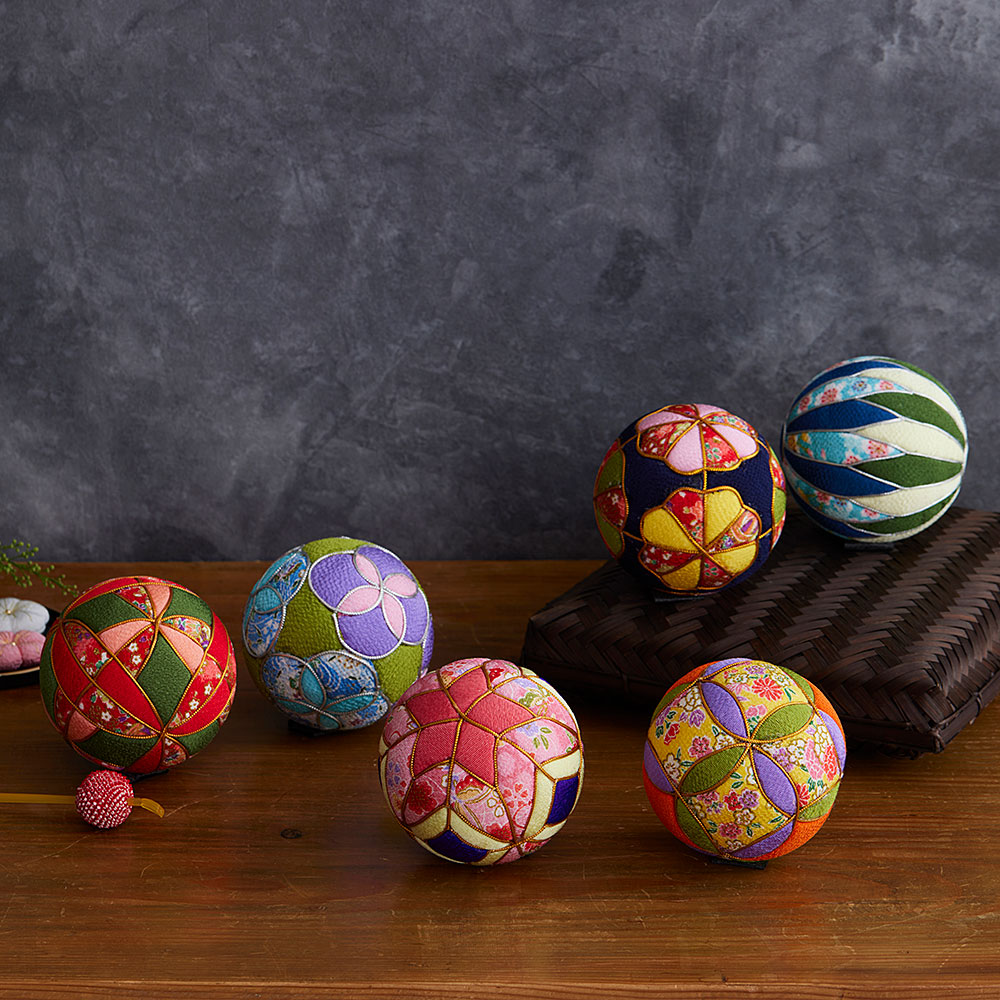 華やかで色鮮やかなちりめん生地を使った木目込みてまりのキット。型紙を土台に写すだけで簡単に柄が描け、美しい和の文様を楽しめます。