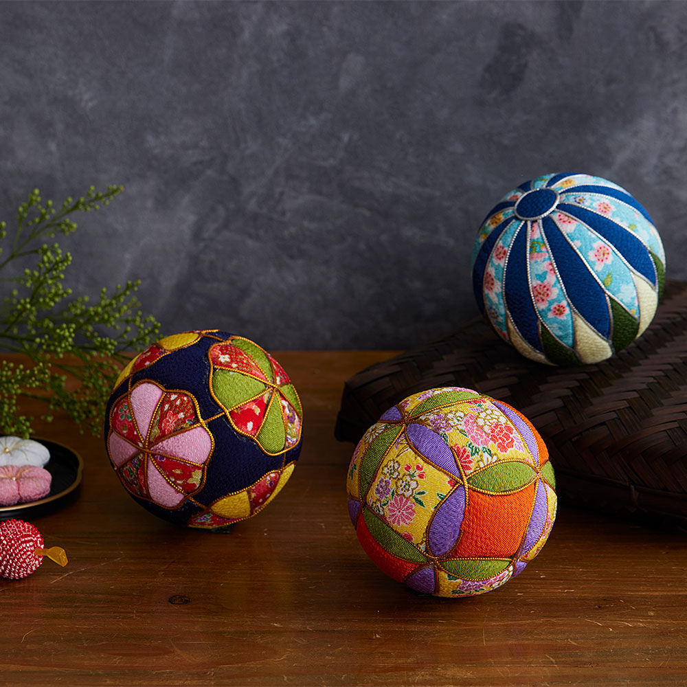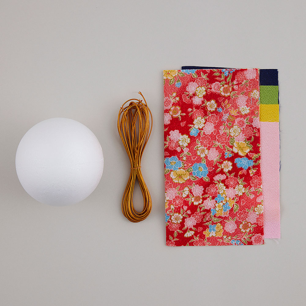 華やかで色鮮やかなちりめん生地を使った木目込みてまりのキット。型紙を土台に写すだけで簡単に柄が描け、美しい和の文様を楽しめます。