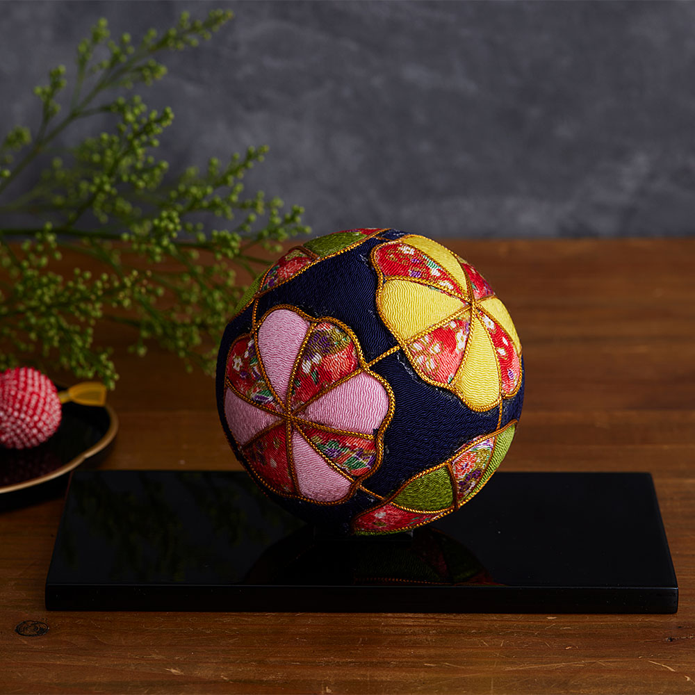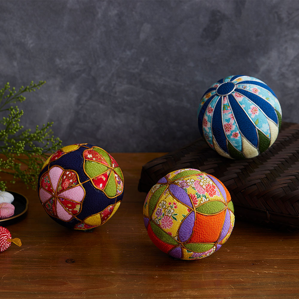 華やかで色鮮やかなちりめん生地を使った木目込みてまりのキット。型紙を土台に写すだけで簡単に柄が描け、美しい和の文様を楽しめます。